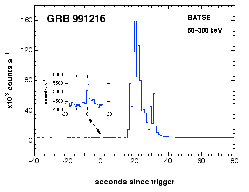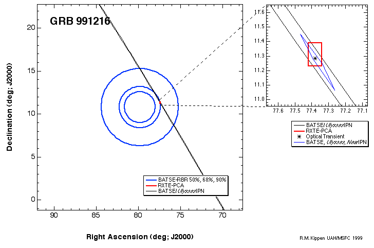 | GRB_991216 | 7906 | GIF | PS | GIF | PS | Very large BATSE burst. Fading x-ray source detectected by RXTE-PCA!! (See GCN Notice). Optical transient discovered!! Detected by Ulysses and NEAR. |