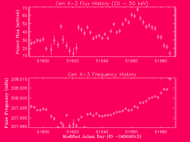 Recent Flux & Frequency HistoryCen X-3 has a period near the the Nyquist limit of 2.048s for the DISCLA data used by the Monitor, so that these measurements