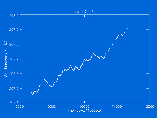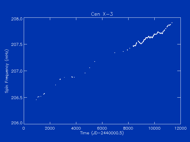 Long-term Frequency HistoryThe same BATSE data is plotted here, along with measurements of the source made since discovery of pulsations.